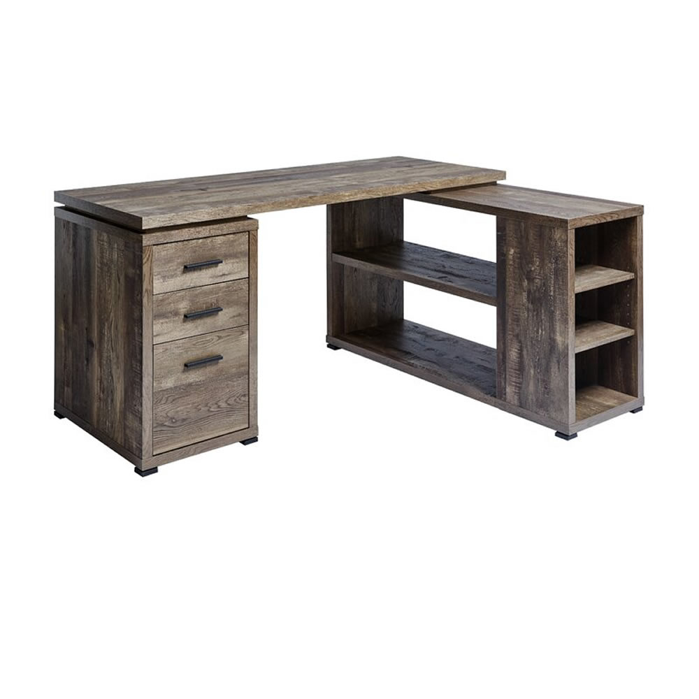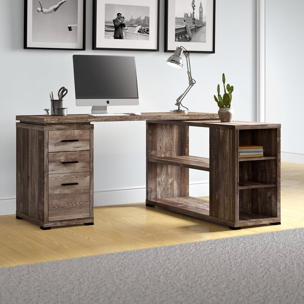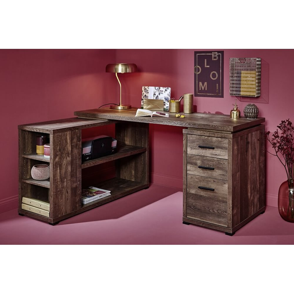 Der L-förmige Büroschreibtisch CLB 355 E von Jahnke besitzt nicht einen stylischen Used Look sondern ist auch sehr praktikabel mit diversen Schubladen und verstellbaren Ablageböden für den durchlässigen Container. Der Tisch ist ebenfalls beidseitig aufbaubar was ihn für fast jedes Arbeitszimmer passend macht.