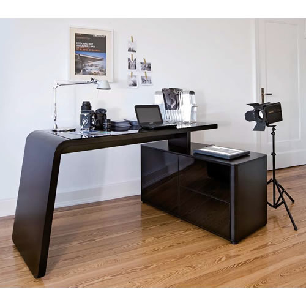 Der Eck-Schreibtisch, in hochwertigem Design, ist an allen Seiten gerundet und seine Korpusteile in Mattlack ausgeführt.