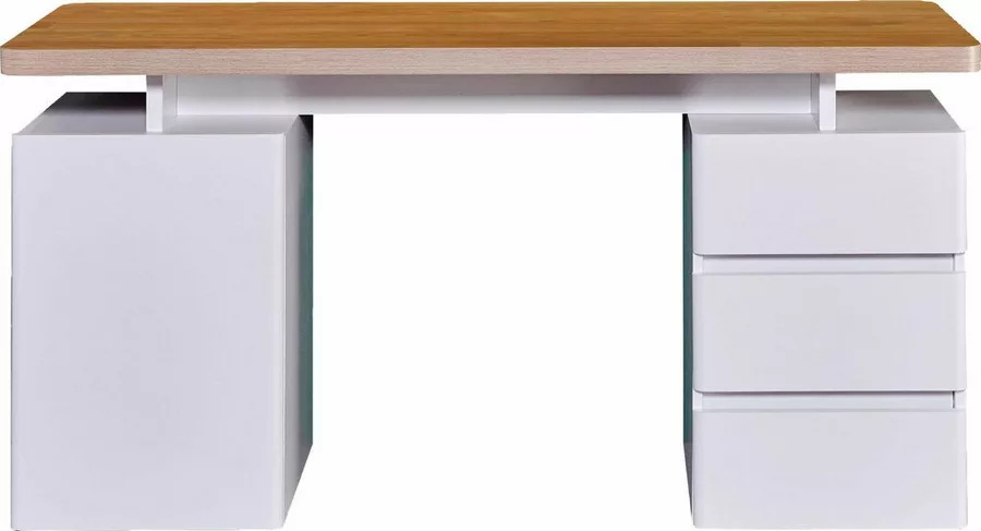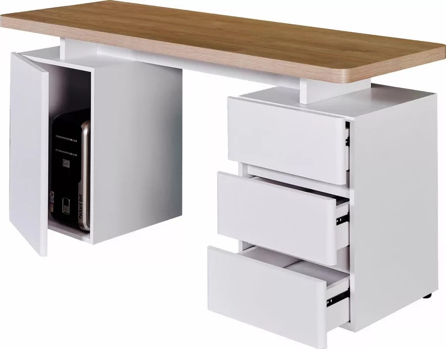 Der kompakt Cuuba LIbre C 250 von Jahnke passt mit seiner geringen Größe auch in kleinere Arbeitsumgebungen wobei er trotzdem noch voll nutzbar ist und mit vielen Schubladen zur Ablage von Utensilien und Dokumenten sowie einer großen Tischplatte aus massivem Holz punktet. Des Weiteren ist hinter dem Schreibtisch noch ein Kabelkanal verborgen welcher für einen Desktop Computer zu Gute kommt. Dieser kann hinter der Tür an der linken Seite verborgen werden.