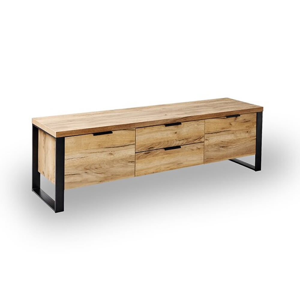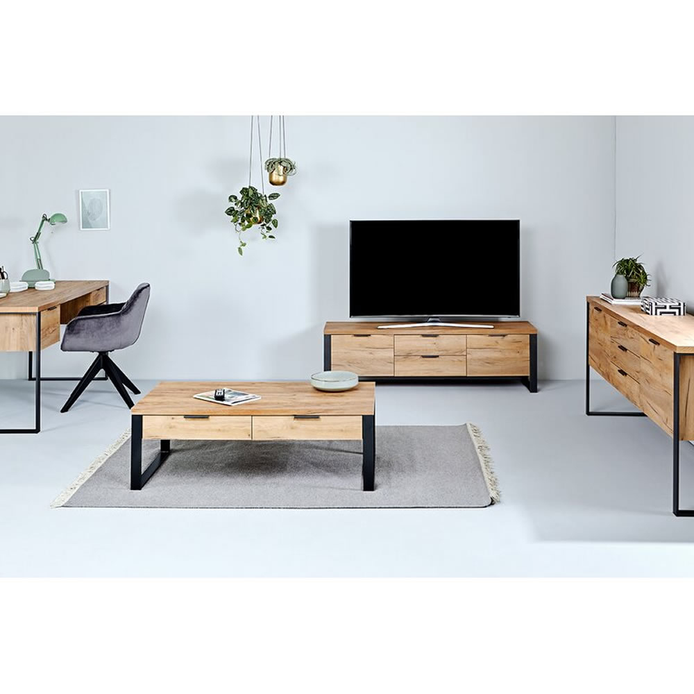 Das Jahnke TV Lowboard TV 150 bietet jede Menge Stauraum für multimediale Geräte für Ihren Fernseher oder sonstiges. Die Schubladen und Türen des Lowboards haben zudem hochwertig verarbeitete Griffe aus Metall woraus auch die Pulverbeschichteten Kufen bestehen. Der Korpus ist aus Spanplatten welche mit Kerneichen Design foliert wurden.